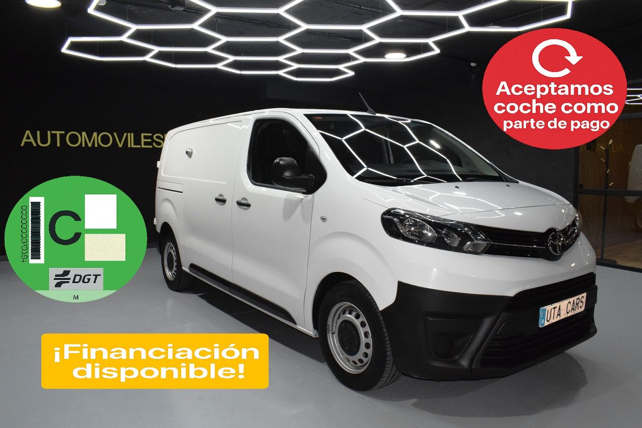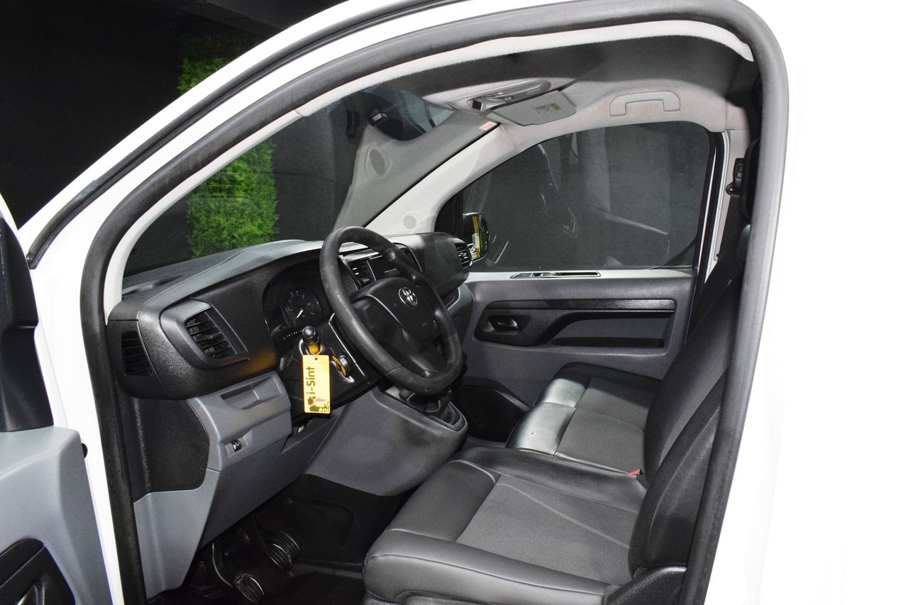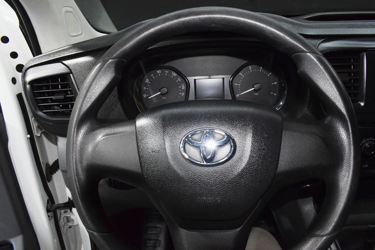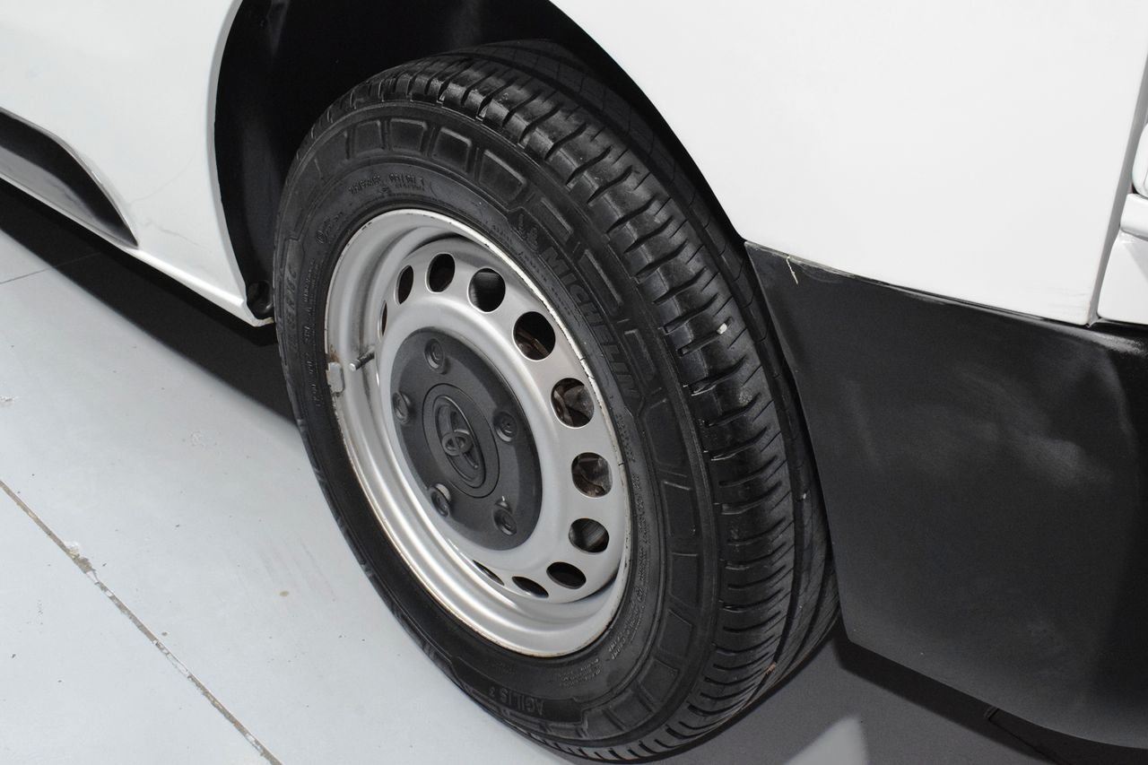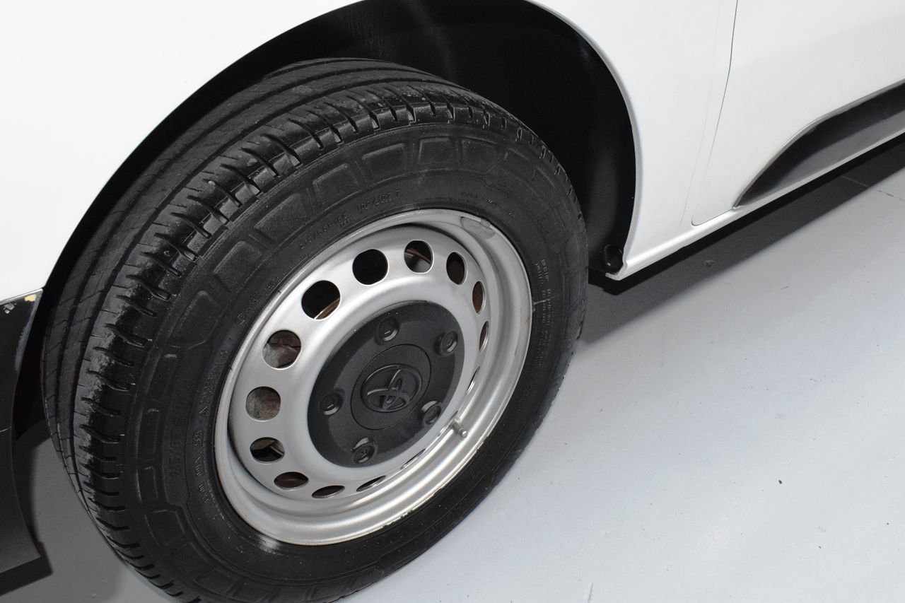 - Paquete Confort- Paquete Visión- Carrocería/estructura: Caja- Luces antiniebla- Perfiles cromados para Luces antiniebla- 3. Luces de freno- Luz de día- Molduras laterales protectoras Negro- Cubierta/revestimiento del umbral- Sistema de audio: Multimedia Toyota Pro Touch- Mando distancia para la radio el Volante- Ordenador de a bordo- Control de crucero (Tempomat)- Sistema limitador de velocidad- Airbag conductor/acompañante- Tabique separador del compartimento de carga con Ventana- Asientos confort- Asiento delante izquierda regulable en altura- Asiento del acompañante doble- Soporte lumbar Asiento delante izquierda- Equipamiento asientos: 3° asiento- Puertas traseras doble hoja Sin Lunas- Puerta corredera Espacio acompañante/Compartimento carga derecha- Inmovilizador- Guantera con Función refrigeradora- Toyota Smart Cargo- Sistema antibloqueo (ABS)- Distribuidor eléctrónico de frenada- Asistente del freno- Asistente a la conducción: Sensor-reconocimiento de cansancio- Rueda de repuesto- Columna de dirección (Volante) regulable- Dirección asistida eléctric.- Toyota tracción Select (TTS)- Programa electrónico de estabilidad (VSC)- Tipo transmisión: Tracción delantera- Asistente a la conducción: Control de subidas en montes (HAC)- Batalla 3275 mm- Caja de cambios 6-marcha- Reducción polución según norma gases escape Euro 6- Stop&Go-System (TSGS)- Filtro partículas- Motor 2,0 Ltr. - 90 kW D-4D CAT